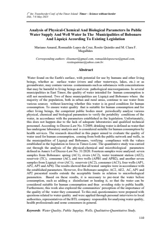 1st Int. Transborder Conf. of the Timor Island: Timor %u2013 Science without borderDili, 7-8 May 2025110Analysis of Physical-Chemical And Biological Parameters In Public Water Supply And Well Water In The Municipalities of Bobonaro And Liqui%u00e7%u00e1 According To Existing Legislation Mariano Amaral, Romualdo Lopes da Cruz, Rosito Quint%u00e3o and M. Clara F. Magalh%u00e3es Corresponding authors: illoamari@gmail.com, romualdolopescruz@gmail.com, rositoquintao@yahoo.com.br.AbstractWater found on the Earth's surface, with potential for use by humans and other living beings, whether as surface water (rivers and other waterways, lakes, etc.) or as groundwater, may contain various contaminants such as substances with concentrations that may be harmful to living beings and even pathological microorganisms. In several municipalities in East Timor, the quality of water intended for human consumption is still not monitored. Two of these municipalities are Liqui%u00e7%u00e1 and Bobonaro where the majority of the population, both in urban and rural areas, continue to use water from various sources without knowing whether this water is in good condition for human consumption. To ensure water quality that is suitable for human consumption and for other living beings, the competent public bodies must periodically analyse various physical, chemical and biological parameters to verify the potability conditions of the water, in accordance with the parameters established in the legislation. Unfortunately, this does not happen due to the lack of adequate laboratories and qualified technical personnel. According to Decree-Law No. 5/2009, drinking water is defined as water that has undergone laboratory analysis and is considered suitable for human consumption by health services. The research described in this paper aimed to evaluate the quality of water used for human consumption, coming from both the public network and wells, in the municipalities of Liqui%u00e7%u00e1 and Bobonaro, verifying compliance with the values established in the legislation in force in Timor-Leste. The quantitative study was carried out through the analysis of the physical-chemical and microbiological parameters defined in Annex I of Decree-Law No. 31/2020. Fourteen samples were analysed: seven samples from Bobonaro: spring (AC1), rivers (AC2), water treatment station (AE2), reservoir (TC), consumer (AC), and two wells (APB1 and APB2), and another seven samples from Liqui%u00e7%u00e1: river (AC1), reservoir (AC2), consumer (AC3), four wells (AP1, AP2, AP3 and AP4). The results showed that all tested samples were in accordance with the established parameters. However, five Bobonaro samples: AC2, AE2, AC, AP1 and AP2 presented results outside the acceptable limits in relation to microbiological parameters. Based on these results, it is necessary to pre-treat the water before consumption, such as adding a disinfectant or heating it, so that the water can be considered suitable for human consumption and thus avoiding risks to public health. Furthermore, this work also explored the communities%u2019 perception of the importance of the quality of the water they consumed. To this end, questionnaires were prepared with questions related to water quality and were applied through personal interviews to local authorities, representatives of the BTL company responsible for analysing water quality, health professionals and some consumers in general. Keywords: Water Quality, Public Supplay, Wells, Qualitative-Quantitative Study,