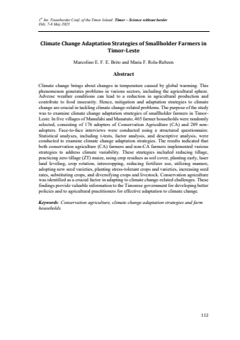 1st Int. Transborder Conf. of the Timor Island: Timor %u2013 Science without borderDili, 7-8 May 2025112Climate Change Adaptation Strategies of Smallholder Farmers in Timor-LesteMarcolino E. F. E. Brito and Maria F. Rola-RubzenAbstractClimate change brings about changes in temperature caused by global warming. This phenomenon generates problems in various sectors, including the agricultural sphere. Adverse weather conditions can lead to a reduction in agricultural production and contribute to food insecurity. Hence, mitigation and adaptation strategies to climate change are crucial in tackling climate change-related problems. The purpose of the study was to examine climate change adaptation strategies of smallholder farmers in TimorLeste. In five villages of Manufahi and Manatuto, 465 farmer households were randomly selected, consisting of 176 adopters of Conservation Agriculture (CA) and 289 nonadopters. Face-to-face interviews were conducted using a structured questionnaire. Statistical analyses, including t-tests, factor analysis, and descriptive analysis, were conducted to examine climate change adaptation strategies. The results indicated that both conservation agriculture (CA) farmers and non-CA farmers implemented various strategies to address climate variability. These strategies included reducing tillage, practicing zero tillage (ZT) maize, using crop residues as soil cover, planting early, laser land leveling, crop rotation, intercropping, reducing fertilizer use, utilizing manure, adopting new seed varieties, planting stress-tolerant crops and varieties, increasing seed rates, substituting crops, and diversifying crops and livestock. Conservation agriculture was identified as a crucial factor in adapting to climate change-related challenges. These findings provide valuable information to the Timorese government for developing better policies and to agricultural practitioners for effective adaptation to climate change. Keywords: Conservation agriculture, climate change adaptation strategies and farm households.