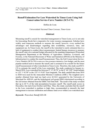1st Int. Transborder Conf. of the Timor Island: Timor %u2013 Science without borderDili, 7-8 May 2025113Runoff Estimation For Loes Watershed In Timor-Leste Using Soil Conservation Service-Curve Number (SCS-CN)Delfim da CostaUniversidade Nacional Timor Lorosae, Timor-LesteAbstractMeasuring runoff is crucial for watershed management in Timor-Leste, as it is not only for forecasting floods but is imperative for water resource management. Scholars have widely used numerous methods to measure the runoff; however, every method has advantages and disadvantages regarding data availability, resources, time, and equipment use. In Timor-Leste, the runoff in the watershed is rarely estimated due to a lack of equipment to conduct direct measurement, limited human resources to measure the runoff, and a low national budget allocated for the mandated department (Watershed Management Department at the Ministry of Agriculture, Fisheries, Livestock, and Forestry, or the National Directorate of Water and Sanitation (DNAS) at the Ministry of Infrastructure) to conduct the runoff measurement. Thus, the Soil Conservation ServiceCurve Number (SCS-CN) is seen as a less resource-intensive, low-budget, and the most popular method used to measure the runoff, and is assumed to be a model for the future runoff measurement of other watersheds in Timor-Leste. Therefore, this study used SCSCN to estimate the runoff of the Loes watershed. The study conducted in January toMarch 2024. Loes watershed lies between 9%u00b0 12' 49.78\to 125%u00b0 1' 42.50\to 2020 were used for the Antecedent Moisture Condition (AMC). The weighted curve number obtained from land use land cover (LULC) generated by the University of Maryland for ASEAN, and the hydrological soil group (HSG) determined according to the soil texture obtained from the ISRIC Soil Data Hub. The result of the study revealed that up to 64 % of the total precipitation becomes runoff. The runoff peak occurs in December, but starts from October until May. Thus, this study concludes that the runoff in the Loes watershed is medium to high; thus, recommended to intensify the land management to increase infiltration and enhance land cover within Loes watershed area.Keywords: Watershed, Runoff, SCS-CN.