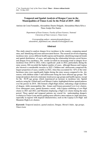 1st Int. Transborder Conf. of the Timor Island: Timor %u2013 Science without borderDili, 7-8 May 2025116Temporal and Spatial Analysis of Dengue Cases in the Municipalities of Timor-Leste In the Priod of 2019 - 2022Ant%u00f3nio da Costa Fernandes, Alexandrino Duarte Delgado, Alexandrina Maria Silva e Nuno Ara%u00fajo Dos SantosDepartment of Exact Sciences, Faculty of Exact Sciences, National University of Timor Lorosa%u2019e, Timor-LesteCorresponding authors: antoniocfernandes@ua.pt; alexandrino_d@hotmail.com; almeida.82silva@gmail.com;AbstractThis study aimed to analyze dengue fever incidence in the country, comparing annual rates, and identifying risk areas and associated factors. The research involved comparing incidence rates across different health regions and hospitals, identifying temporal trends and spatial distribution of cases, and analyzing the relationship between social factors and dengue fever incidence. The results revealed an increasing trend in dengue fever incidence from 2019 to 2022, with a significant peak in 2022, particularly during the rainy season. Dili recorded the highest number of cases, although Baucau and Liqui%u00e7a also showed a considerable increase in 2022. Children and adolescents comprised the largest proportion of cases, notably in 2022, when they accounted for 42% of the total. Incidence rates were significantly higher during the rainy season compared to the dry season, with children under 5 and adolescents being the most affected age groups. The temporal analysis showed a stationary trend across age groups and health regions, except for the 50-59 age group, which experienced an increase in incidence rate. Spatial analysis, using the Global and Local Moran's I index, highlighted distinct spatial patterns over the period. In 2019, Dili formed a High-High cluster, indicating a high incidence of dengue, while municipalities like Ainaro and Ermera presented Low-Low clusters. Over subsequent years, spatial dynamics varied, with Liqui%u00e7a exhibiting a Low-High cluster in 2021 and 2022, and Manatuto displaying a High Low cluster during the same period. These spatial and temporal patterns are crucial for understanding dengue's evolution in Timor-Leste and for guiding more effective interventions in high-risk areas, especially in regions with atypical characteristics, such as the Liqui%u00e7a Low-High and Manatuto High-Low clusters. Keywords: Temporal analysis, spatial analysis, Dengue, Moran's Index, Age groups, Timor-Leste