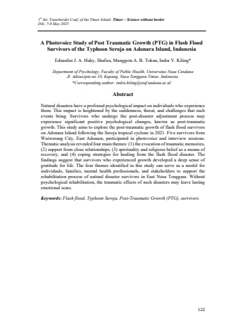 1st Int. Transborder Conf. of the Timor Island: Timor %u2013 Science without borderDili, 7-8 May 2025122A Photovoice Study of Post Traumatic Growth (PTG) in Flash Flood Survivors of the Typhoon Seroja on Adonara Island, IndonesiaEduardus J. A. Huky, Shafira, Manggota A. B. Tokan, Indra Y. Kiling*Department of Psychology, Faculty of Public Health, Universitas Nusa Cendana Jl. Adisucipto no 10, Kupang, Nusa Tenggara Timur, Indonesia.*Corresponding author: indra.kiling@staf.undana.ac.idAbstractNatural disasters have a profound psychological impact on individuals who experience them. This impact is heightened by the suddenness, threat, and challenges that such events bring. Survivors who undergo the post-disaster adjustment process may experience significant positive psychological changes, known as post-traumatic growth. This study aims to explore the post-traumatic growth of flash flood survivors on Adonara Island following the Seroja tropical cyclone in 2021. Five survivors from Waiwerang City, East Adonara, participated in photovoice and interview sessions. Thematic analysis revealed four main themes: (1) the evocation of traumatic memories, (2) support from close relationships, (3) spirituality and religious belief as a means of recovery, and (4) coping strategies for healing from the flash flood disaster. The findings suggest that survivors who experienced growth developed a deep sense of gratitude for life. The four themes identified in this study can serve as a model for individuals, families, mental health professionals, and stakeholders to support the rehabilitation process of natural disaster survivors in East Nusa Tenggara. Without psychological rehabilitation, the traumatic effects of such disasters may leave lasting emotional scars.Keywords: Flash flood, Typhoon Seroja, Post-Traumatic Growth (PTG), survivors.