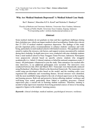 1st Int. Transborder Conf. of the Timor Island: Timor %u2013 Science without borderDili, 7-8 May 2025123Why Are Medical Students Depressed? A Medical School Case StudyIka F. Buntoro1, Marcelino K.P.A. Keraf2and Nicholas E. Handoyo1*1Faculty of Medicine and Veterinary Medicine, Universitas Nusa Cendana, Indonesia.2 Faculty of Public Health, Universitas Nusa Cendana, Kupang, Indonesia*Corresponding author: nicholas.handoyo@staf.undana.ac.idAbstractSome medical students do not graduate on time and face significant challenges during their clerkship year, which can impact medical school accreditation. Studies have shown that 27%u201332% of medical students experience depression. The findings of this study provide important policy recommendations to enhance students%u2019 resilience and wellbeing, particularly in rural medical schools with limited resources. This qualitative study aimed to explore the stressors, risk factors, and support systems encountered by students during their clerkship. In-depth interviews were conducted with nine clerkship students from a rural medical school in Nusa Tenggara Timur Province, Indonesia. Participants were purposively selected based on specific criteria: students who struggledacademically (i.e., failed %u22653 clinical rotations or failed the national competence exam %u22653 times). All participants volunteered to join the study. Data saturation was reached after nine interviews, so no additional participants were recruited. The interviews were conducted between July 2022 and March 2023. Transcripts were thematically analysed using Richardson%u2019s Resiliency Model as the theoretical framework. The transcripts were coded using pre-developed codes based on the model, and the resulting codes were organized into subthemes and overarching themes. Several stressors were identified, with the most modifiable being related to the role of clinical supervisors in the teaching and learning process. Both risk and protective factors affecting students%u2019 resilience and well-being were noted, particularly those linked to academic processes. Clinical supervisors play a crucial role in fostering student resilience. Therefore, training is needed to help supervisors transition from being potential sources of stress to becoming supportive figures in the students%u2019 learning journey.Keywords: clinical clerkships; medical students; psychological stressors; resilience.