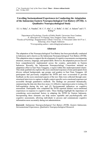 1st Int. Transborder Conf. of the Timor Island: Timor %u2013 Science without borderDili, 7-8 May 2025124Unveiling Socioemotional Experiences in Conducting the Adaptation of the Indonesian Eastern Neuropsychological Test Battery (INTB): A Qualitative Neuropsychological StudyE.J. A. Huky1, A. Nandini1, M. C. F. Alta1, C. A. Bulla1, G. Ida1, A. Sulastri2and I. Y. Kiling1*1Department of Psychology, Faculty of Public Health, Universitas Nusa Cendana,Jl. Adisucipto no 10, Kupang, Nusa Tenggara Timur, Indonesia.2Faculty of Psychology, Soegijapranata Catholic University, Jl. Pawiyatan Luhur Sel IV no 1, Semarang, Jawa Tengah, Indonesia.*Corresponding authors: indra.kiling@staf.undana.ac.idAbstractThe adaptation of the Neuropsychological Test Battery has been periodically conducted in Indonesia and is known as the Indonesian Neuropsychological Test Battery (INTB). This adaptation aims to support the development of cognitive assessments encompassing attention, memory, language, and spatial skills. However, the adaptation process has not been comprehensively implemented across the country, particularly in Eastern Indonesia. Recently, the Indonesian Neuropsychology Consortium initiated an adaptation effort in East Nusa Tenggara, a region within this underrepresented cluster.This study qualitatively explores the socio-emotional responses of nine participants from diverse cultural backgrounds, age groups, and genders in East Nusa Tenggara. All participants had previously completed the INTB and were re-recruited to provide feedback on the socio-emotional aspects of the test. Data were collected through semistructured interviews to capture in-depth, context-specific socio-emotional responses not accessible through quantitative methods. The findings are presented thematically, summarizing the data into three key areas: (1) Affective experiences prior to testing, (2) Self-regulation during the test, and (3) Environmental influences on cognitive assessment. Participants who completed the INTB reported distinct socio-emotional experiences in response to cognitive tasks. These findings highlight the importance of considering socio-emotional factors in adapting the INTB for Eastern Indonesia. Incorporating these elements can help ensure equitable and psychologically safe cognitive assessments, allowing individuals to process and communicate cognitive information more accurately during test administration.Keywords: Indonesian Neuropsychological Test Battery (INTB), Eastern Indonesian, Socioemotional Experiences, Qualitative Neuropsychological Research.