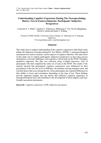 1st Int. Transborder Conf. of the Timor Island: Timor %u2013 Science without borderDili, 7-8 May 2025125Understanding Cognitive Experience During The Neoropsychology Battery Test in Eastern Indonesia: Participants' Subjective PerspectivesLionesius P. T. Huttu*, Gianina V. Talumewo, Philomena F. Tae, Novita Magdalena, Gloria G. Bouk and Indra Y. Killing1Faculty of Public Health, Universitas Nusa Cendana, Jl. Adisucipto no 10, Kupang, Indonesia.*Corresponding author: piterhutu@gmail.comAbstractThis study aims to explore understanding of the cognitive experiences individuals when taking the Indonesia Neuropsychological Test Battery (INTB), a neuropsychological assessment tool used to measure various aspects of cognitive function. The main focus of this study was to explore participants' subjective perspectives on how they process information, overcome challenges, and respond to various tasks in the INTB. Through a qualitative approach, this data was collected using in-depth interviews with 10 participants who had completed the entire set of tests in the INTB. The results of the analysis showed that participants' cognitive experiences were influenced by their perceptions of the test, the level of difficulty, the problem-solving strategies used, and external factors that arose during the test. Some participants also reported differences in their ability to focus and concentrate, depending on the type of test. These findings provide important insights into the factors that influence cognitive experience in neuropsychological tests, and contribute to the development of more adaptive and userfriendly assessment instruments.Keywords: Cognitive experience, INTB, subjective perception.
