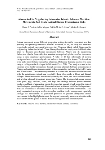 1st Int. Transborder Conf. of the Timor Island: Timor %u2013 Science without borderDili, 7-8 May 2025128Atauro And Its Neighboring Indonesian Islands: Informal Maritime Movements And Exotic Animal Disease Transmission RisksAbrao J. Pereira1, Julito Magno, Fidelia M. de C. Alves1, Marito B. Gomes11Animal health Department, Faculty of Agriculture, Universidade Nacional Timor Lorosae (UNTL)AbstractAnimal movement across different geographic settings is widely recognized as a key pathway for spreading infectious diseases. However, so far, no study has examined cross-border animal movement between a tiny Timorese island called Atauro and its neighboring Indonesian islands. Thus, this rapid qualitative inquiry was held in October 2023 to describe cross-border movements between Atauro and its neighboring Indonesian islands. Data collection was done through in-depth face-to-face interviews, using a semi-structured questionnaire. A total of 29 key informants of diverse backgrounds were purposively selected and were interviewed in Atauro. The interviews were audio-recorded and transcribed afterward. Deductive thematic analysis was done using a coding matrix developed in Microsoft Excel 2016. This study revealed active informal cross-border interactions through informal channels between communities in Atauro and neighboring islands, mainly with communities in Liran, followed by Alor and Wetar islands. The community members in Atauro who have the most interactions with the neighboring islands are reportedly those who reside in Beloi and Biqueli villages. These interactions are driven by family ties, trade, and socio-cultural events, and involve informal live animal import into Atauro. The top imported animal species were goats, pigs, chickens, cattle, and dogs. Our findings indicate porous maritime borders, and lack of quarantine checks for imported animals which poses the risks of introducing and spreading exotic diseases of animal health and public health importance. We also found lack of awareness about exotic diseases within the communities. This study emphasized an urgent need to strengthen maritime border management, especially through the enforcement of quarantine protocols to prevent unregulated animal movements. It also highlights the need for targeted community awareness about the risks associated with the spread of exotic diseases through informal animal imports. Key words: Atauro, cross border, animal movement, islands, Indonesia