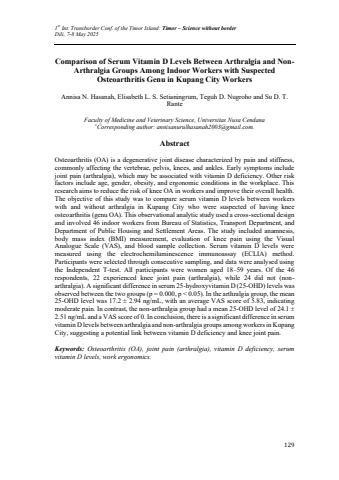 1st Int. Transborder Conf. of the Timor Island: Timor %u2013 Science without borderDili, 7-8 May 2025129Comparison of Serum Vitamin D Levels Between Arthralgia and NonArthralgia Groups Among Indoor Workers with Suspected Osteoarthritis Genu in Kupang City WorkersAnnisa N. Hasanah, Elisabeth L. S. Setianingrum, Teguh D. Nugroho and Su D. T.RanteFaculty of Medicine and Veterinary Science, Universitas Nusa Cendana*Corresponding author: annisanurulhasanah2003@gmail.com.AbstractOsteoarthritis (OA) is a degenerative joint disease characterized by pain and stiffness, commonly affecting the vertebrae, pelvis, knees, and ankles. Early symptoms include joint pain (arthralgia), which may be associated with vitamin D deficiency. Other risk factors include age, gender, obesity, and ergonomic conditions in the workplace. This research aims to reduce the risk of knee OA in workers and improve their overall health.The objective of this study was to compare serum vitamin D levels between workers with and without arthralgia in Kupang City who were suspected of having knee osteoarthritis (genu OA). This observational analytic study used a cross-sectional design and involved 46 indoor workers from Bureau of Statistics, Transport Department, and Department of Public Housing and Settlement Areas. The study included anamnesis, body mass index (BMI) measurement, evaluation of knee pain using the Visual Analogue Scale (VAS), and blood sample collection. Serum vitamin D levels were measured using the electrochemiluminescence immunoassay (ECLIA) method. Participants were selected through consecutive sampling, and data were analysed using the Independent T-test. All participants were women aged 18%u201359 years. Of the 46 respondents, 22 experienced knee joint pain (arthralgia), while 24 did not (nonarthralgia). A significant difference in serum 25-hydroxyvitamin D (25-OHD) levels was observed between the two groups (p = 0.000, p < 0.05). In the arthralgia group, the mean 25-OHD level was 17.2 %u00b1 2.94 ng/mL, with an average VAS score of 5.83, indicating moderate pain. In contrast, the non-arthralgia group had a mean 25-OHD level of 24.1 %u00b1 2.51 ng/mL and a VAS score of 0. In conclusion, there is a significant difference in serum vitamin D levels between arthralgia and non-arthralgia groups among workers in Kupang City, suggesting a potential link between vitamin D deficiency and knee joint pain.Keywords: Osteoarthritis (OA), joint pain (arthralgia), vitamin D deficiency, serum vitamin D levels, work ergonomics.