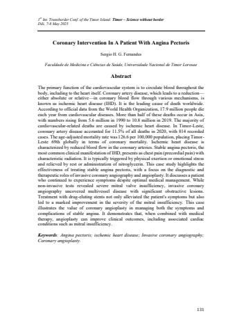 1st Int. Transborder Conf. of the Timor Island: Timor %u2013 Science without borderDili, 7-8 May 2025131Coronary Intervention In A Patient With Angina PectorisSergio H. G. FernandesFaculdade de Medicina e Ci%u00eancias de Sa%u00fade, Universidade Nacional de Timor LorosaeAbstractThe primary function of the cardiovascular system is to circulate blood throughout the body, including to the heart itself. Coronary artery disease, which leads to a reduction%u2014either absolute or relative%u2014in coronary blood flow through various mechanisms, is known as ischemic heart disease (IHD). It is the leading cause of death worldwide.According to official data from the World Health Organization, 17.9 million people die each year from cardiovascular diseases. More than half of these deaths occur in Asia, with numbers rising from 5.6 million in 1990 to 10.8 million in 2019. The majority of cardiovascular-related deaths are caused by ischemic heart disease. In Timor-Leste, coronary artery disease accounted for 11.5% of all deaths in 2020, with 814 recordedcases. The age-adjusted mortality rate was 126.6 per 100,000 population, placing TimorLeste 69th globally in terms of coronary mortality. Ischemic heart disease is characterized by reduced blood flow in the coronary arteries. Stable angina pectoris, the most common clinical manifestation of IHD, presents as chest pain (precordial pain) with characteristic radiation. It is typically triggered by physical exertion or emotional stress and relieved by rest or administration of nitroglycerin. This case study highlights the effectiveness of treating stable angina pectoris, with a focus on the diagnostic and therapeutic roles of invasive coronary angiography and angioplasty. It discusses a patient who continued to experience symptoms despite optimal medical management. While non-invasive tests revealed severe mitral valve insufficiency, invasive coronary angiography uncovered multivessel disease with significant obstructive lesions. Treatment with drug-eluting stents not only alleviated the patient's symptoms but also led to a marked improvement in the severity of the mitral insufficiency. This case illustrates the value of coronary angioplasty in managing both the symptoms and complications of stable angina. It demonstrates that, when combined with medical therapy, angioplasty can improve clinical outcomes, including associated cardiac conditions such as mitral insufficiency.Keywords: Angina pectoris; ischemic heart disease; Invasive coronary angiography; Coronary angioplasty.
