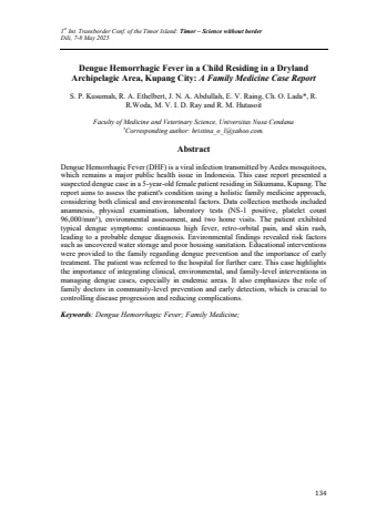1st Int. Transborder Conf. of the Timor Island: Timor %u2013 Science without borderDili, 7-8 May 2025134Dengue Hemorrhagic Fever in a Child Residing in a Dryland Archipelagic Area, Kupang City: A Family Medicine Case ReportS. P. Kusumah, R. A. Ethelbert, J. N. A. Abdullah, E. V. Raing, Ch. O. Lada*, R. R.Woda, M. V. I. D. Ray and R. M. HutasoitFaculty of Medicine and Veterinary Science, Universitas Nusa Cendana*Corresponding author: hristina_o_l@yahoo.com.AbstractDengue Hemorrhagic Fever (DHF) is a viral infection transmitted by Aedes mosquitoes, which remains a major public health issue in Indonesia. This case report presented a suspected dengue case in a 5-year-old female patient residing in Sikumana, Kupang. Thereport aims to assess the patient's condition using a holistic family medicine approach, considering both clinical and environmental factors. Data collection methods included anamnesis, physical examination, laboratory tests (NS-1 positive, platelet count96,000/mm%u00b3), environmental assessment, and two home visits. The patient exhibited typical dengue symptoms: continuous high fever, retro-orbital pain, and skin rash, leading to a probable dengue diagnosis. Environmental findings revealed risk factors such as uncovered water storage and poor housing sanitation. Educational interventions were provided to the family regarding dengue prevention and the importance of early treatment. The patient was referred to the hospital for further care. This case highlightsthe importance of integrating clinical, environmental, and family-level interventions in managing dengue cases, especially in endemic areas. It also emphasizes the role of family doctors in community-level prevention and early detection, which is crucial to controlling disease progression and reducing complications.Keywords: Dengue Hemorrhagic Fever; Family Medicine;