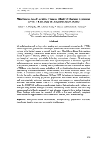 1st Int. Transborder Conf. of the Timor Island: Timor %u2013 Science without borderDili, 7-8 May 2025138Mindfulness-Based Cognitive Therapy Effectively Reduces Depression Levels: A Case Study at Universitas Nusa CendanaIndah Y. P. Ouwpoly, I M. Artawan, Rizky P. Manafe and Nicholas E. Handoyo*Faculty of Medicine and Veterinary Medicine, University of Nusa Cendana, Jl. Adisucipto No 10, Kupang, Nusa Tenggara Timur, Indonesia.*Corresponding author: bahrulilmiabdurahman@gmail.comAbstractMental disorders such as depression, anxiety, and post-traumatic stress disorder (PTSD) remain significant global health challenges, particularly in underserved and transborder regions with limited access to mental health care. Mindfulness-Based Interventions (MBIs), including Mindfulness-Based Stress Reduction (MBSR) and MindfulnessBased Cognitive Therapy (MBCT), have emerged as promising approaches for psychological recovery, potentially inducing neuroplastic changes. Neuroimaging evidence suggests that MBIs modulate brain regions implicated in emotional regulation and stress response; however, a comprehensive synthesis of their neurobiological effects in psychiatric populations is lacking. This systematic review aims to evaluate the impact of MBIs on brain plasticity among individuals with psychiatric disorders and assess their applicability in transborder mental health contexts, such as the Indonesia%u2013Timor Leste border. A systematic search is being conducted across PubMed, Scopus, and Google Scholar for studies published between 2015 and 2025. Inclusion criteria encompass peerreviewed studies involving psychiatric populations, mindfulness-based interventions, and neuroplasticity outcomes assessed through neuroimaging or neurophysiological measures. The review adheres to PRISMA 2020 guidelines, with risk of bias evaluated using the ROBINS-I tool for non-randomized studies. Data extraction and synthesis are managed using Review Manager (RevMan). Preliminary results indicate that MBIs may enhance prefrontal-limbic connectivity and attenuate hyperactivity in limbic structures. These findings underscore the potential of MBIs as low-cost, culturally adaptable interventions to support mental health in resource-limited, cross-border settings.Keywords: mindfulness-based interventions, neuroplasticity, psychiatric disorders, transborder health, neuroimaging, mental health access.