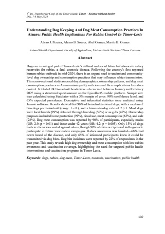 1st Int. Transborder Conf. of the Timor Island: Timor %u2013 Science without borderDili, 7-8 May 2025139Understanding Dog Keeping And Dog Meat Consumption Practices In Ainaro: Public Health Implications For Rabies Control In Timor-LesteAbrao J. Pereira, Alcino B. Soares, Abel Gomes, Marito B. GomesAnimal Health Department, Faculty of Agriculture, Universidade Nacional Timor LorosaeAbstractDogs are an integral part of Timor-Leste%u2019s cultural and social fabric but also serve as key reservoirs for rabies, a fatal zoonotic disease. Following the country's first reported human rabies outbreak in mid-2024, there is an urgent need to understand communitylevel dog ownership and consumption practices that may influence rabies transmission. This cross-sectional study assessed dog demographics, ownership patterns, and dog meat consumption practices in Ainaro municipality and examined their implications for rabies control. A total of 247 household heads were interviewed between January and February 2025 using a structured questionnaire on the Epicollect5 mobile platform. Sample size was calculated using Statulator with a 5% margin of error, 90% confidence level, and 65% expected prevalence. Descriptive and inferential statistics were analyzed using Jamovi software. Results showed that 96% of households owned dogs, with a median of two dogs per household (range: 1%u201311), and a human-to-dog ratio of 2.3:1. Most dogs were local breeds (99%) obtained through breeding (56%) or as gifts (42%). Ownership purposes included home protection (99%), ritual use, meat consumption (63%), and sale (28%). Dog meat consumption was reported by 90% of participants, especially males (OR: 2.9; p = 0.01) and those under 42 years (OR: 4.2; p = 0.003). Only 13% of dogs had ever been vaccinated against rabies, though 98% of owners expressed willingness to participate in future vaccination campaigns. Rabies awareness was limited%u201466% had never heard of the disease, and only 65% of informed participants knew it could be transmitted via dog bites. Dog bite incidents were reported by 22% of respondents in the past year. This study reveals high dog ownership and meat consumption with low rabies awareness and vaccination coverage, highlighting the need for targeted public health interventions and vaccination programs in Timor-Leste.Keywords: dogs, rabies, dog meat, Timor-Leste, zoonosis, vaccination, public health.