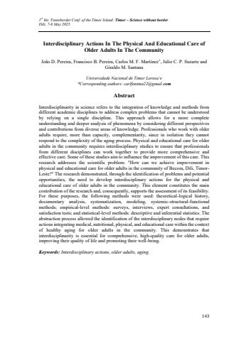 1st Int. Transborder Conf. of the Timor Island: Timor %u2013 Science without borderDili, 7-8 May 2025143Interdisciplinary Actions In The Physical And Educational Care of Older Adults In The CommunityJo%u00e3o D. Pereira, Francisco B. Pereira, Carlos M. F. Mart%u00ednez*, Julio C. P. Suzarte and Giraldo M. SantanaUniversidade Nacional de Timor Lorosa%u2019e*Corresponding authors: carlfontma22@gmail.comAbstractInterdisciplinarity in science refers to the integration of knowledge and methods from different academic disciplines to address complex problems that cannot be understood by relying on a single discipline. This approach allows for a more complete understanding and deeper analysis of phenomena by considering different perspectives and contributions from diverse areas of knowledge. Professionals who work with older adults require, more than capacity, complementarity, since in isolation they cannot respond to the complexity of the aging process. Physical and educational care for older adults in the community requires interdisciplinary studies to ensure that professionals from different disciplines can work together to provide more comprehensive and effective care. Some of these studies aim to influence the improvement of this care. This research addresses the scientific problem: \physical and educational care for older adults in the community of Becora, D%u00edli, TimorLeste?\opportunities, the need to develop interdisciplinary actions for the physical and educational care of older adults in the community. This element constitutes the main contribution of the research and, consequently, supports the assessment of its feasibility. For these purposes, the following methods were used: theoretical-logical history, documentary analysis, systematization, modeling, systemic-structural-functional methods; empirical-level methods: surveys, interviews, expert consultations, and satisfaction tests; and statistical-level methods: descriptive and inferential statistics. The abstraction process allowed the identification of the interdisciplinary nodes that require actions integrating medical, nutritional, physical, and educational care within the context of healthy aging for older adults in the community. This demonstrates that interdisciplinarity is essential for comprehensive, high-quality care for older adults, improving their quality of life and promoting their well-being.Keywords: Interdisciplinary actions, older adults, aging.