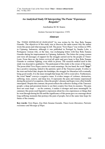 1st Int. Transborder Conf. of the Timor Island: Timor %u2013 Science without borderDili, 7-8 May 2025144An Analytical Study Of Interpreting The Poem %u201cEsperan%u00e7as Rasgadas%u201dAuxiliadora M. M. SoaresInstituto Nacional de Linguistica- UNTLAbstractThe %u2018POEM ESPERAN%u00c7AS RASGADAS%u201d by was writen by Sir. Kay Rala Xanana Gusm%u00e3o. The objectives of this study was to discover the main reason why the author wrote this poem and what message he left. The poem \in Cipinang, Indonesia, although it was published in Portugal by Sandra Lobo, a Portuguese woman who, at the time, was exchanging letters with Kay Rala Xanana Gusm%u00e3o during his imprisonment in Cipinang, Indonesia. The letters the young woman sent were all messages of support for the struggle carried out by the people of TimorLeste. From then on, the letters revived all spirit and gave hope to Kay Rala Xanana Gusm%u00e3o to continue fighting, even while in prison. The research method used in this study was descriptive qualitative. The participant of this study is the owner of the poem.The poem titled Torn Hopes carries two main meanings. On one hand, the word %u201chope%u201dhas a positive meaning, linked to the patriotic spirit of the Timorese people. It refers to the trust and belief that, despite the hardships, the struggle for liberation will eventually bring good results. It is the inner strength that keeps the will to resist alive. Furthermore, the word %u201ctorn%u201d conveys a negative sense. It evokes images of violence, destruction, suffering, tears, sorrow, and deep loss. It represents the pain and trauma experienced during the period of occupation, when the people%u2019s dreams and hopes were often brutally interrupted. Despite this contrast, the poem reflects the collective feeling of the Timorese people: a deep and persistent desire to see their country free from its enemies. The pain does not erase hope %u2014 on the contrary, it makes it stronger and more meaningful. In summary this poem used figurative expression about his own experiences or things that he went through during his life and the significance of this poem gave us a message about long-suffering moments that portrays the pain of people, but at the same time hope for future of the country. Key words: Torn Hopes, Kay Rala Xanana Gusm%u00e3o, Timor-Leste liberation, Patriotic resistance and Message of Hope.