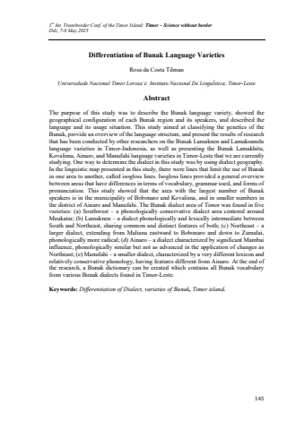 1st Int. Transborder Conf. of the Timor Island: Timor %u2013 Science without borderDili, 7-8 May 2025145Differentiation of Bunak Language VarietiesRosa da Costa TilmanUniversidade Nacional Timor Lorosa%u2019e Instituto Nacional De Lingu%u013astica, Timor-LesteAbstractThe purpose of this study was to describe the Bunak language variety, showed the geographical configuration of each Bunak region and its speakers, and described the language and its usage situation. This study aimed at classifying the genetics of the Bunak, provide an overview of the language structure, and present the results of research that has been conducted by other researchers on the Bunak Lamaknen and Lamaksanulu language varieties in Timor-Indonesia, as well as presenting the Bunak Lamakhitu, Kovalima, Ainaro, and Manufahi language varieties in Timor-Leste that we are currently studying. One way to determine the dialect in this study was by using dialect geography. In the linguistic map presented in this study, there were lines that limit the use of Bunak in one area to another, called isogloss lines. Isogloss lines provided a general overview between areas that have differences in terms of vocabulary, grammar used, and forms of pronunciation. This study showed that the area with the largest number of Bunak speakers is in the municipality of Bobonaro and Kovalima, and in smaller numbers in the district of Ainaro and Manufahi. The Bunak dialect area of Timor was found in five varieties: (a) Southwest %u2013 a phonologically conservative dialect area centered around Maukatar; (b) Lamaknen %u2013 a dialect phonologically and lexically intermediate between South and Northeast, sharing common and distinct features of both; (c) Northeast %u2013 a larger dialect, extending from Maliana eastward to Bobonaro and down to Zumalai, phonologically more radical; (d) Ainaro %u2013 a dialect characterized by significant Mambai influence, phonologically similar but not as advanced in the application of changes as Northeast; (e) Manufahi %u2013 a smaller dialect, characterized by a very different lexicon and relatively conservative phonology, having features different from Ainaro. At the end of the research, a Bunak dictionary can be created which contains all Bunak vocabulary from various Bunak dialects found in Timor-Leste.Keywords: Differentiation of Dialect, varieties of Bunak, Timor island.