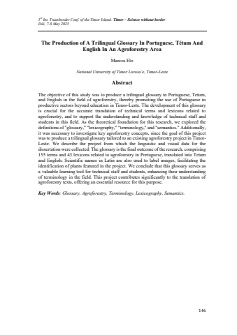 1st Int. Transborder Conf. of the Timor Island: Timor %u2013 Science without borderDili, 7-8 May 2025146The Production of A Trilingual Glossary In Portuguese, T%u00e9tum And English In An Agroforestry Area Marcos EloNational University of Timor Lorosa%u00b4e, Timor-LesteAbstractThe objective of this study was to produce a trilingual glossary in Portuguese, Tetum, and English in the field of agroforestry, thereby promoting the use of Portuguese in productive sectors beyond education in Timor-Leste. The development of this glossaryis crucial for the accurate translation of technical terms and lexicons related to agroforestry, and to support the understanding and knowledge of technical staff and students in this field. As the theoretical foundation for this research, we explored thedefinitions of \it was necessary to investigate key agroforestry concepts, since the goal of this project was to produce a trilingual glossary tailored to an existing agroforestry project in TimorLeste. We describe the project from which the linguistic and visual data for the dissertation were collected. The glossary is the final outcome of the research, comprising 155 terms and 43 lexicons related to agroforestry in Portuguese, translated into Tetum and English. Scientific names in Latin are also used to label images, facilitating the identification of plants featured in the project. We conclude that this glossary serves as a valuable learning tool for technical staff and students, enhancing their understanding of terminology in the field. This project contributes significantly to the translation of agroforestry texts, offering an essential resource for this purpose.Key Words: Glossary, Agroforestry, Terminology, Lexicography, Semantics.