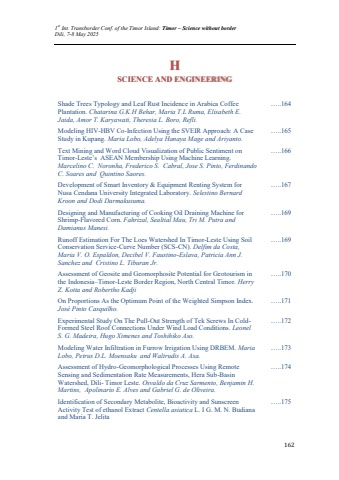 1st Int. Transborder Conf. of the Timor Island: Timor %u2013 Science without borderDili, 7-8 May 2025162HSCIENCE AND ENGINEERINGShade Trees Typology and Leaf Rust Incidence in Arabica Coffee Plantation. Chatarina G.K.H Behar, Maria T.L Ruma, Elisabeth E. Jaida, Amor T. Karyawati, Theresia L. Boro, Refli.%u2026..164 Modeling HIV-HBV Co-Infection Using the SVEIR Approach: A Case Study in Kupang. Maria Lobo, Adelya Hanaya Mage and Ariyanto.%u2026..165 Text Mining and Word Cloud Visualization of Public Sentiment on Timor-Leste%u2019s ASEAN Membership Using Machine Learning. Marcelino C. Noronha, Frederico S. Cabral, Jose S. Pinto, Ferdinando C. Soares and Quintino Saores.%u2026..166 Development of Smart Inventory & Equipment Renting System for Nusa Cendana University Integrated Laboratory. Selestino Bernard Kroon and Dodi Darmakusuma.%u2026..167 Designing and Manufacturing of Cooking Oil Draining Machine for Shrimp-Flavored Corn. Fahrizal, Sealtial Mau, Tri M. Putra and Damianus Manesi.%u2026..169 Runoff Estimation For The Loes Watershed In Timor-Leste Using Soil Conservation Service-Curve Number (SCS-CN). Delfim da Costa, Maria V. O. Espaldon, Decibel V. Faustino-Eslava, Patricia Ann J. Sanchez and Cristino L. Tiburan Jr.%u2026..169 Assessment of Geosite and Geomorphosite Potential for Geotourism in the Indonesia%u2013Timor-Leste Border Region, North Central Timor. Herry Z. Kotta and Robertho Kadji%u2026..170 On Proportions As the Optimum Point of the Weighted Simpson Index. Jos%u00e9 Pinto Casquilho.%u2026..171 Experimental Study On The Pull-Out Strength of Tek Screws In ColdFormed Steel Roof Connections Under Wind Load Conditions. Leonel S. G. Madeira, Hugo Ximenes and Toshihiko Aso.%u2026..172 Modeling Water Infiltration in Furrow Irrigation Using DRBEM. Maria Lobo, Petrus D.L. Moensaku and Waltrudis A. Asa.%u2026..173 Assessment of Hydro-Geomorphological Processes Using Remote Sensing and Sedimentation Rate Measurements, Hera Sub-Basin Watershed, Dili- Timor Leste. Osvaldo da Cruz Sarmento, Benjamin H. Martins, Apolinario E. Alves and Gabriel G. de Oliveira.%u2026..174 Identification of Secondary Metabolite, Bioactivity and Sunscreen Activity Test of ethanol Extract Centella asiatica L. I G. M. N. Budiana and Maria T. Jelita%u2026..175