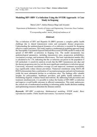 1st Int. Transborder Conf. of the Timor Island: Timor %u2013 Science without borderDili, 7-8 May 2025165Modeling HIV-HBV Co-Infection Using the SVEIR Approach: A Case Study in KupangMaria Lobo*, Adelya Hanaya Mage and Ariyanto1Department of Mathematics, Faculty of Science and Engineering, Universitas Nusa Cendana, Indonesia*Corresponding author: maria_lobo@staf.undana.ac.idAbstractThe co-infection of HIV and Hepatitis B (HBV) presents a complex public health challenge due to shared transmission routes and synergistic disease progression. Understanding the epidemiological dynamics of co-infection is essential for designing effective control measures. This study employs a mathematical modeling approach using the Susceptible-Vaccinated-Exposed-Infected-Recovered (SVEIR) model to analyze the spread of HIV-HBV co-infection in Kupang City. The model incorporates key epidemiological parameters, including transmission rates, progression probabilities, vaccination coverage, and treatment effectiveness. The basic reproduction number (R%u2080) is calculated to be 1.36, indicating that the co-infection can persist in the population if left unchecked. A sensitivity analysis reveals that the HBV transmission rate (%ud835%udefd%ud835%udc35) and the disease progression rate (%ud835%udefe%ud835%udc35) are the most significant contributors to infection spread. Conversely, increased vaccination coverage (%ud835%udc63) and improved treatment accessibility (%ud835%udf0e%ud835%udc35) significantly reduce disease prevalence. Numerical simulations using MATLAB R2023a demonstrate that a combination of vaccination programs and antiviral treatments yields the most substantial decline in co-infection rates. The findings offer valuable insights for policymakers, healthcare providers, and public health authorities in formulating targeted, evidence-based interventions. By addressing both prevention and treatment simultaneously, it is possible to reduce the burden of HIV-HBV co-infection and improve overall health outcomes in affected communities. This study underscores the critical role of mathematical modeling in informing public health decision-making and optimizing resource allocation for disease control.Keywords: HIV-HBV co-infection, Mathematical modeling, SVEIR model, Basic reproduction number, Public health intervention, Vaccination strategies
