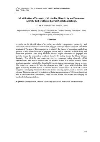 1st Int. Transborder Conf. of the Timor Island: Timor %u2013 Science without borderDili, 7-8 May 2025175Identification of Secondary Metabolite, Bioactivity and Sunscreen Activity Test of ethanol Extract Centella asiatica LI G. M. N. Budiana*and Maria T. JelitaDeptartment of Chemistry, Faculty of Education and Teacher Training, Universitas Nusa Cendana, Indonesia.*Corresponding author: gusti_budiana@staf.undana.ac.idAbstractA study on the identification of secondary metabolite components, bioactivity, and sunscreen activity of ethanol extract from pegagan leaves (Centella asiatica L.) has been conducted. The aim of this research was to identify the classes of secondary metabolites present in the ethanol extract of pegagan leaves and to evaluate its bioactivity and sunscreen potential. The study involved several stages: extraction of pegagan leaf powder using the maceration method, bioactivity testing using the Brine Shrimp Lethality Test (BSLT), and sunscreen activity evaluation using ultraviolet (UV) spectroscopy. The results revealed that the ethanol extract of Centella asiatica leaves contains secondary metabolites from the flavonoid, tannin, saponin, and steroid groups. The lethal concentration (LC%u2085%u2080) value obtained was 69.051 ppm, which is below 1000 ppm, indicating that the extract is toxic to Artemia salina larvae. A lower LC%u2085%u2080 value suggests a stronger potential to eliminate disease-causing agents, such as bacteria and viruses. The sunscreen activity test showed that at a concentration of 250 ppm, the extract had a Sun Protection Factor (SPF) value of 9.33, which falls within the category of moderate to high protection.Keywords: identification, extract, secondary metabolite, sunscreen and bioactivity.