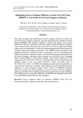 1st Int. Transborder Conf. of the Timor Island: Timor %u2013 Science without borderDili, 7-8 May 2025176Optimizing Furrow Irrigation Efficiency on Pima Clay Soil Using DRBEM: A Case Study in East Nusa Tenggara, IndonesiaM Lobo1*, M. S. M. Nur 2, R. D. Guntur1, Ariyanto1and B. J. Septory11 Department of Mathematics, Nusa Cendana University, Kupang, Indonesia2 Department of Agrotechnology, Nusa Cendana University, Kupang, Indonesia*Corresponding author: maria_lobo@staf.undana.ac.idAbstractThis study investigates the optimization of furrow irrigation efficiency on Pima clay soil in East Nusa Tenggara, Indonesia, using the Dual Reciprocity Boundary Element Method (DRBEM). The method is applied to simulate and analyze water content distribution within the soil domain, where the primary variable %u03a6 denotes volumetric water content in cubic meters per cubic meter (m%u00b3/m%u00b3). Given the high water-holding capacity and low permeability of Pima clay, understanding spatial moisture patterns is critical for improving irrigation performance. The DRBEM model incorporates both boundary and interior collocation points to numerically solve the governing partial differential equations. Simulation results reveal significant moisture concentration near the furrow boundary, with peak values reaching up to %u03a6=0.6951%u2009m3/m3, indicating intense initial infiltration. In the interior domain, water content stabilizes at levels ranging from %u03a6=1.005 to %u03a6=1.180%u2009m3/m3, reflecting efficient water redistribution and retention deeper in the soil profile. However, extreme anomalies%u2014such as %u03a6=16.280%u2009m3/m3and %u03a6=%u221261.3096%u2009m3/m3highlight potential numerical instabilities or inconsistencies in boundary conditions. These suggest a need for mesh refinement and calibration of input parameters. Despite these outliers, the DRBEM simulation effectively captures the critical dynamics of water movement in furrow irrigation, offering a powerful tool for evaluating and enhancing irrigation layouts and scheduling. The insights gained are especially valuable for sustainable water management in waterscarce agricultural regions like East Nusa Tenggara.Keywords: Furrow irrigation, Water use efficiency, DRBEM, Pima Clay soil, Numerical modeling, Irrigation scheduling, Semi-arid agriculture.