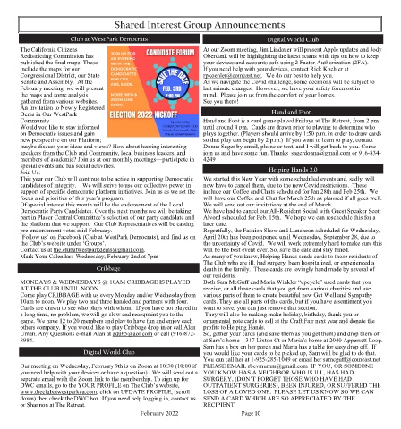 part in Placer Central Committee’s selection of our party candidate and Alvord scheduled for Feb. 15th. We hope we can reschedule this for a