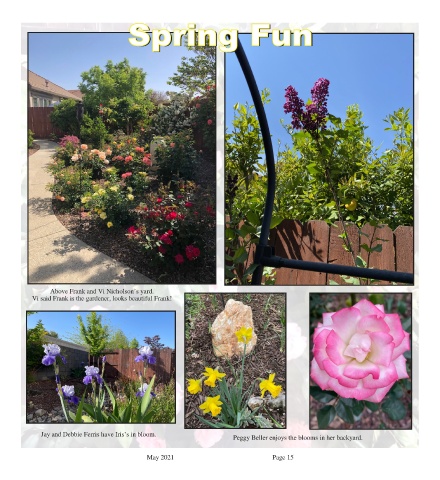 Above Frank and Vi Nicholson’s yard. Vi said Frank is the gardener, looks beautiful Frank! Jay and Debbie Ferris have Iris’s in bloom. Peggy Beller enjoys the blooms in her backyard. May 2021 Page 15