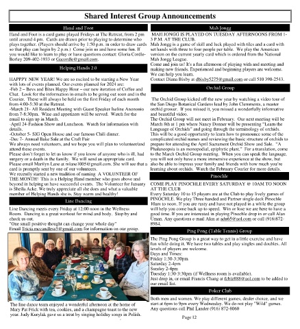 beyond in helping us have successful events. The Volunteer for January COME PLAY PINOCHLE EVERY SATURDAY @ 10AM TO NOON