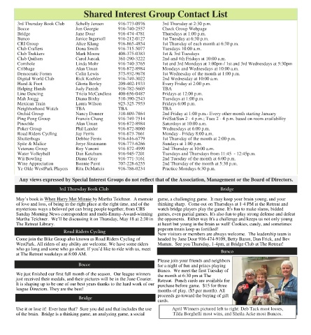 WestPark. All riders of any ability are welcome. We have some riders Mumm. See you Thursday, 1-4pm, at Bridge Club at The Retreat!