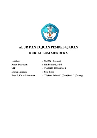 ALUR DAN TUJUAN PEMBELAJARAN KURIKULUM MERDEKA Institusi : SMAN 1 Srengat Nama Penyusun : Siti Fatimah, S.Pd NIP : 19650912 198803 2014 Mata pelajaran : Seni Rupa Fase F, Kelas / Semester : XI (Dua Belas) / I (Ganjil) & II (Genap)