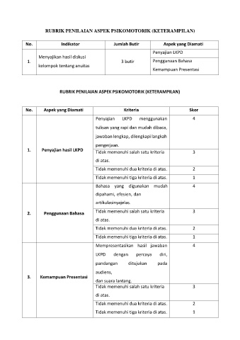 RUBRIK PENILAIAN ASPEK PSIKOMOTORIK (KETERAMPILAN)