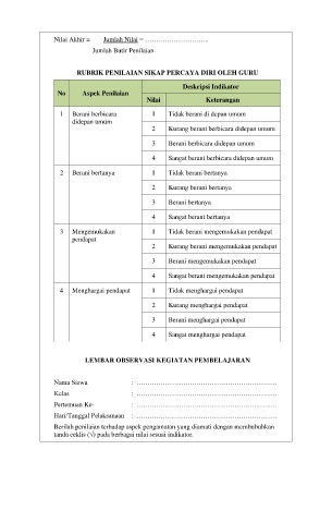 RUBRIK PENILAIAN SIKAP PERCAYA DIRI OLEH GURU