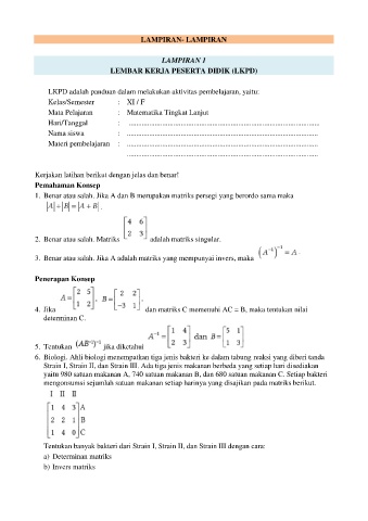 3. Benar atau salah. Jika A adalah matriks yang mempunyai invers, maka