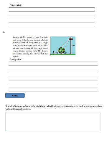 Penyelesaian : 2. Penyelesaian : KREASI Buatlah sebuah permaslaahan dalam kehidupan sehari-hari yang berkaitan dengan perbandingan trigonometri dan tentukanlah penyelesaiannya.