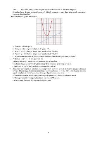 b. Lakukan fungsi komposisi (f ◦ g)(x) dan (g ◦ f)(x). Jelaskan hasil yang diperoleh.