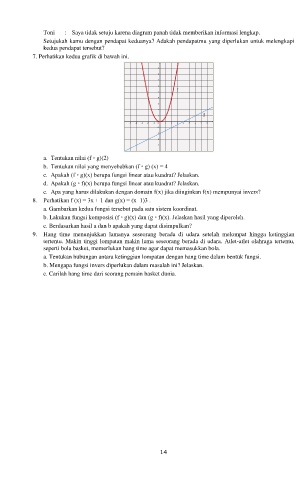 b. Lakukan fungsi komposisi (f ◦ g)(x) dan (g ◦ f)(x). Jelaskan hasil yang diperoleh.
