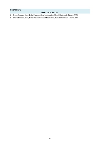 LAMPIRAN 4 DAFTAR PUSTAKA 1. Dicky Susanto, dkk., Buku Panduan Guru Matematika, Kemdikbudristek, Jakarta, 2021 2. Dicky Susanto, dkk., Buku Panduan Siswa Matematika, Kemdikbudristek, Jakarta, 2021 55