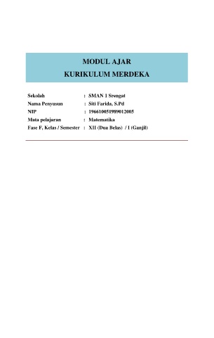 MODUL AJAR KURIKULUM MERDEKA Sekolah : SMAN 1 Srengat Nama Penyusun : Siti Farida, S.Pd NIP : 196610051989012005 Mata pelajaran : Matematika Fase F, Kelas / Semester : XII (Dua Belas) / I (Ganjil)