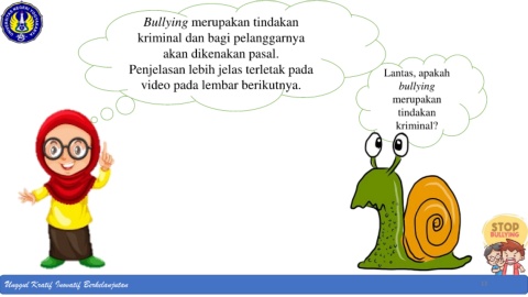 Bullying merupakan tindakan kriminal dan bagi pelanggarnya akan dikenakan pasal. Penjelasan lebih jelas terletak pada Lantas, apakah video pada lembar berikutnya. bullying merupakan tindakan kriminal? Unggul Kratif Inovatif Berkelanjutan 13