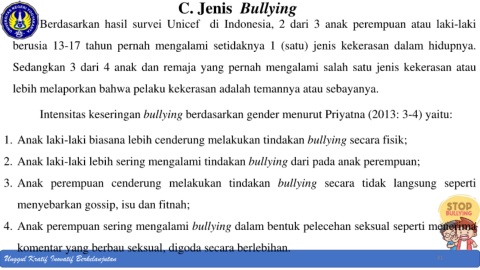 Berdasarkan hasil survei Unicef di Indonesia, 2 dari 3 anak perempuan atau laki-laki