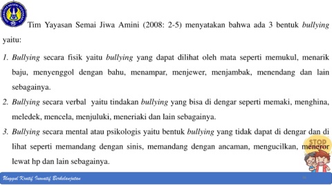 Tim Yayasan Semai Jiwa Amini (2008: 2-5) menyatakan bahwa ada 3 bentuk bullying