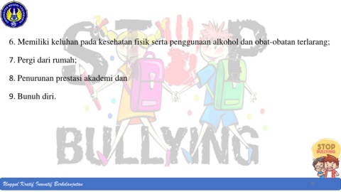 6. Memiliki keluhan pada kesehatan fisik serta penggunaan alkohol dan obat-obatan terlarang; 7. Pergi dari rumah; 8. Penurunan prestasi akademi dan 9. Bunuh diri. Unggul Kratif Inovatif Berkelanjutan 40