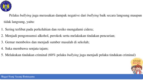 5. Melakukan tindakan criminal (60% pelaku bullying juga menjadi pelaku tindakan criminal)