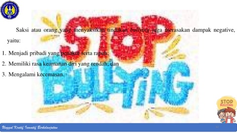 Saksi atau orang yang menyaksikan tindakan bullying juga merasakan dampak negative, yaitu: 1. Menjadi pribadi yang penakut serta rapuh; 2. Memiliki rasa keamanan diri yang rendah; dan 3. Mengalami kecemasan. Unggul Kratif Inovatif Berkelanjutan 42