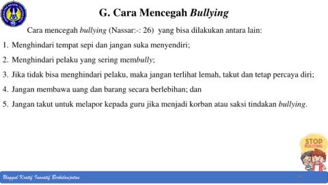 Cara mencegah bullying (Nassar:-: 26) yang bisa dilakukan antara lain: