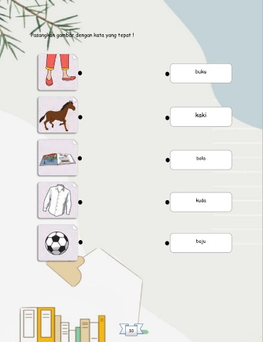 Pasangkan gambar dengan kata yang tepat ! buku kaki bola kuda baju 30