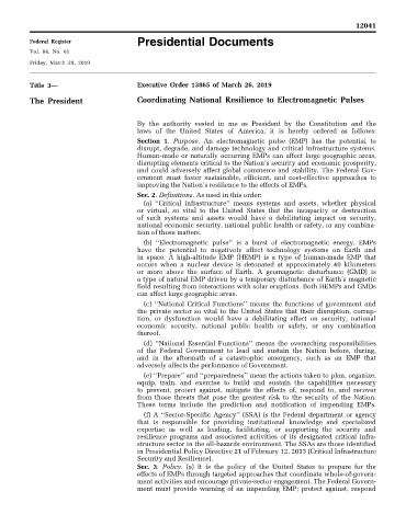 The President Coordinating National Resilience to Electromagnetic Pulses