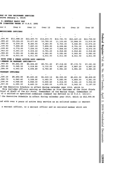 UNJ:l!'OI.IMBD 2019) 1, PAY BASXC 37 UNDBll. 8 OVer OFPXCBli.S $12,088.20 10,164.60 8,239.20 7,268.40 6,772.80 6, 241 .. 50 5,083.80 4,011.90 YEARS WARRANT $6,241.50 5,245.50 4,442.40 Ol!'l!'XCBRS $5,452,80 4,940.40 4,648.80 4,290.30 Executive·schedule of Executive Schedule years 4 officer,