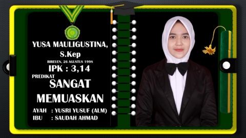 YUSA MAULIGUSTINA, S.Kep BIREUEN, 26 AGUSTUS 1998 IPK : 3,14 PREDIKAT SANGAT MEMUASKAN AYAH : YUSRI YUSUF (ALM) IBU : SAUDAH AHMAD