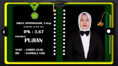 NIKEN APDININGSIH, S.Kep GEURUGOK, 26 JUNI 1997 IPK : 3,67 PREDIKAT PUJIAN AYAH : SAMIDI (ALM) IBU : NURMALA SARI