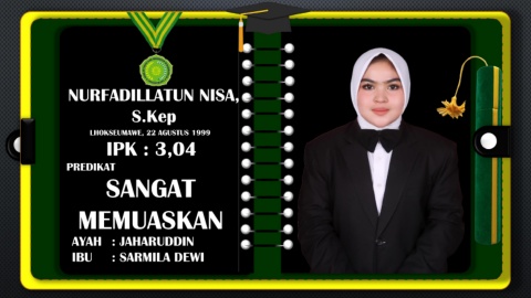 NURFADILLATUN NISA, S.Kep LHOKSEUMAWE, 22 AGUSTUS 1999 IPK : 3,04 PREDIKAT SANGAT MEMUASKAN AYAH : JAHARUDDIN IBU : SARMILA DEWI