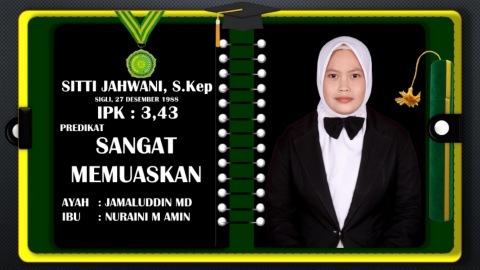 SITTI JAHWANI, S.Kep SIGLI, 27 DESEMBER 1988 IPK : 3,43 PREDIKAT SANGAT MEMUASKAN AYAH : JAMALUDDIN MD IBU : NURAINI M AMIN