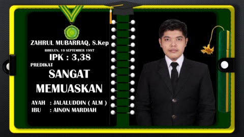ZAHRUL MUBARRAQ, S.Kep BIREUEN, 19 SEPTEMBER 1997 IPK : 3,38 PREDIKAT SANGAT MEMUASKAN AYAH : JALALUDDIN ( ALM ) IBU : AINON MARDIAH